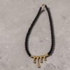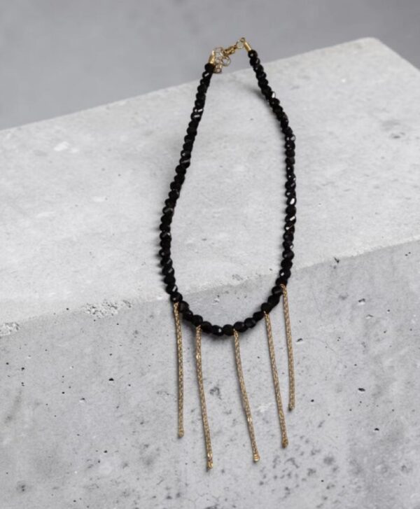 Ένα ιδιαίτερο χειροποίητο κόσμημα σε μαύρο χρώμα με χρυσές λεπτομέρειες από ανοξείδωτο ατσάλι , μοναδικό για βραδινές εξόδους